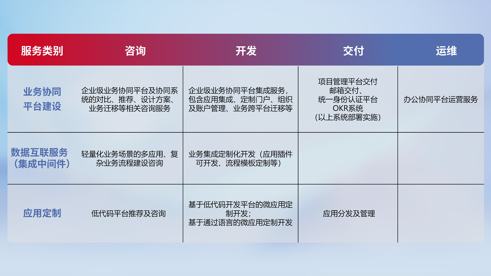 针对钉钉、、企微、、IDaas等平台级产品提供产品的规划、、、、方案、、、交付、、、、定制化开发等服务,,实现如统一协同办公、、、、智能客户服务、、混合会议管理、、智能数据查询、、、、等业务场景,,,,实现数字化转型。。